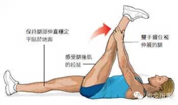 作法:平躺于地面,并伸直双腿。轮流将一脚抬起,并保持膝关节伸直固定,然后将脚趾头朝向身体方向拉。假如柔软度很好,可将大腿拉近身体,增加伸展强度。