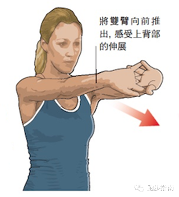 作法:手指交扣,掌心向外,将双手抬至胸前高度并伸直手臂,锁住手肘并将肩部向前推出。