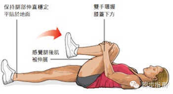 作法:平躺于地面,并伸直双腿。将左膝弯屈,并慢慢拉向胸口,直到肌肉有被伸展的感觉。保持后脑勺与地面接触。放松然后回复起始位置,换边进行。