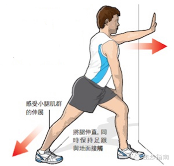 作法:采站姿于墙前约一大步的位置,手推墙壁,双脚站立与髋同宽。将左腿向前跨呈屈膝姿势,并维持左膝盖在脚的正上方,勿歪向一边。感觉右小腿肌群被拉扯到。换边进行左小腿的伸展。