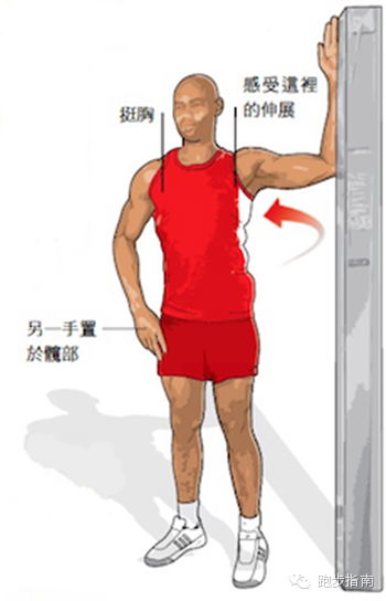 作法:站立在稳定的直立支撑物旁。将一手置于支撑物后,保持上臂与肩膀在同一平面。将身体慢慢向前推出,直到胸部肌肉有伸展的感觉。